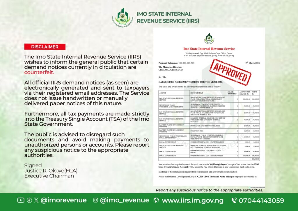 DISCLAIMER FROM THE IMO STATE INTERNAL REVENUE SERVICE
